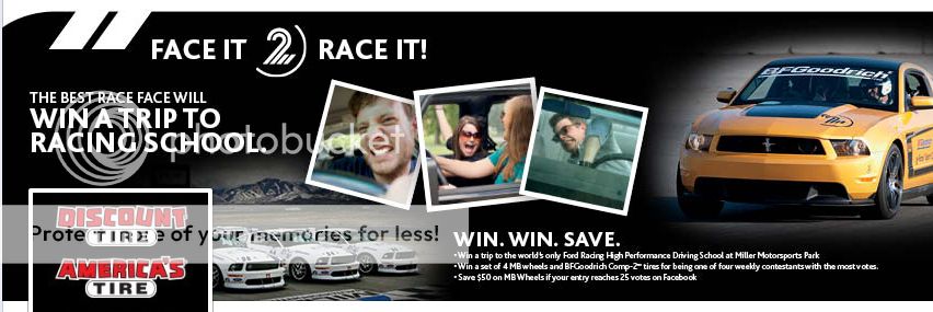 Check it out! We're running a Facebook Promotion right now where you could win a set of MB wheels and Comp2 tires or better yet, a trip to racing school! (ends Aug. 28th, 2012), click on the "Face it 2 Race it" tab under the main profile image for details: http://www.facebook.com/DiscountTire